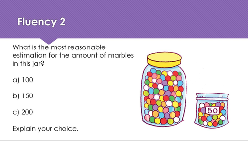 A powerpoint resource where the ch have to estimate how many items they can see on the screen tell a friend their estimate and then finally count all to check their estimate.