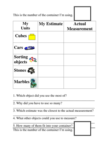 They choose 2 then choose the objects they will be using to fill their container cubes marbles cars etc and write them in the first column.
