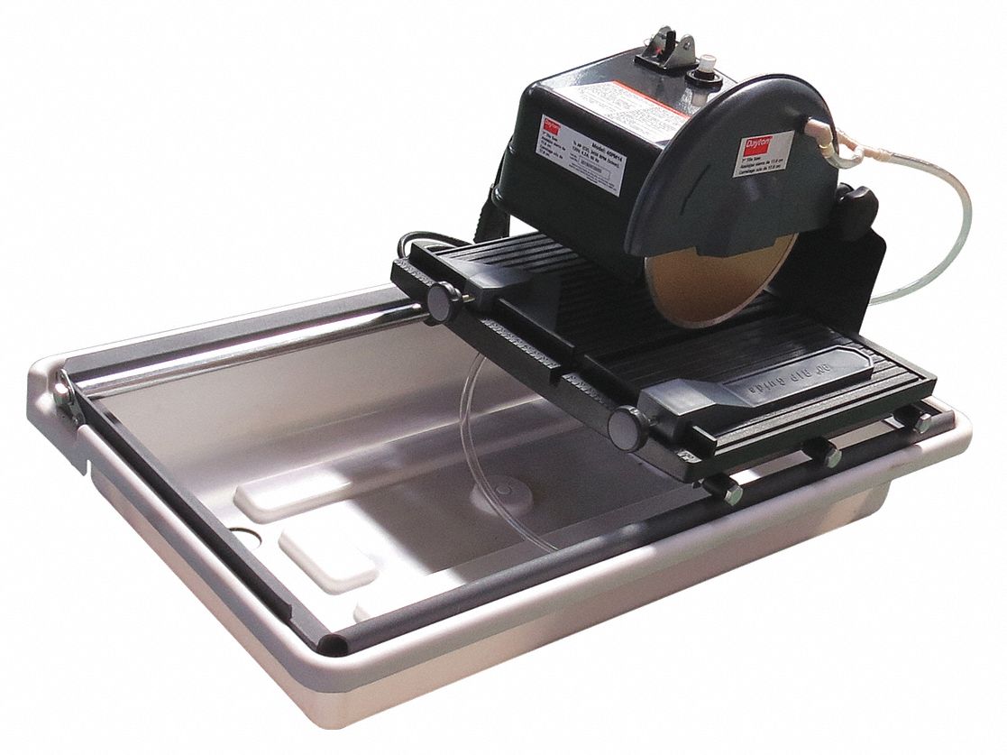 A workforce tile cutter uses a diamond tipped circular saw blade to cut ceramic or porcelain tile.