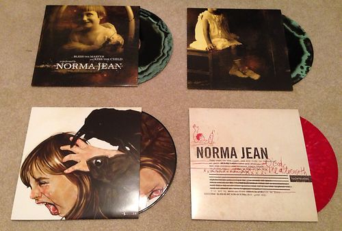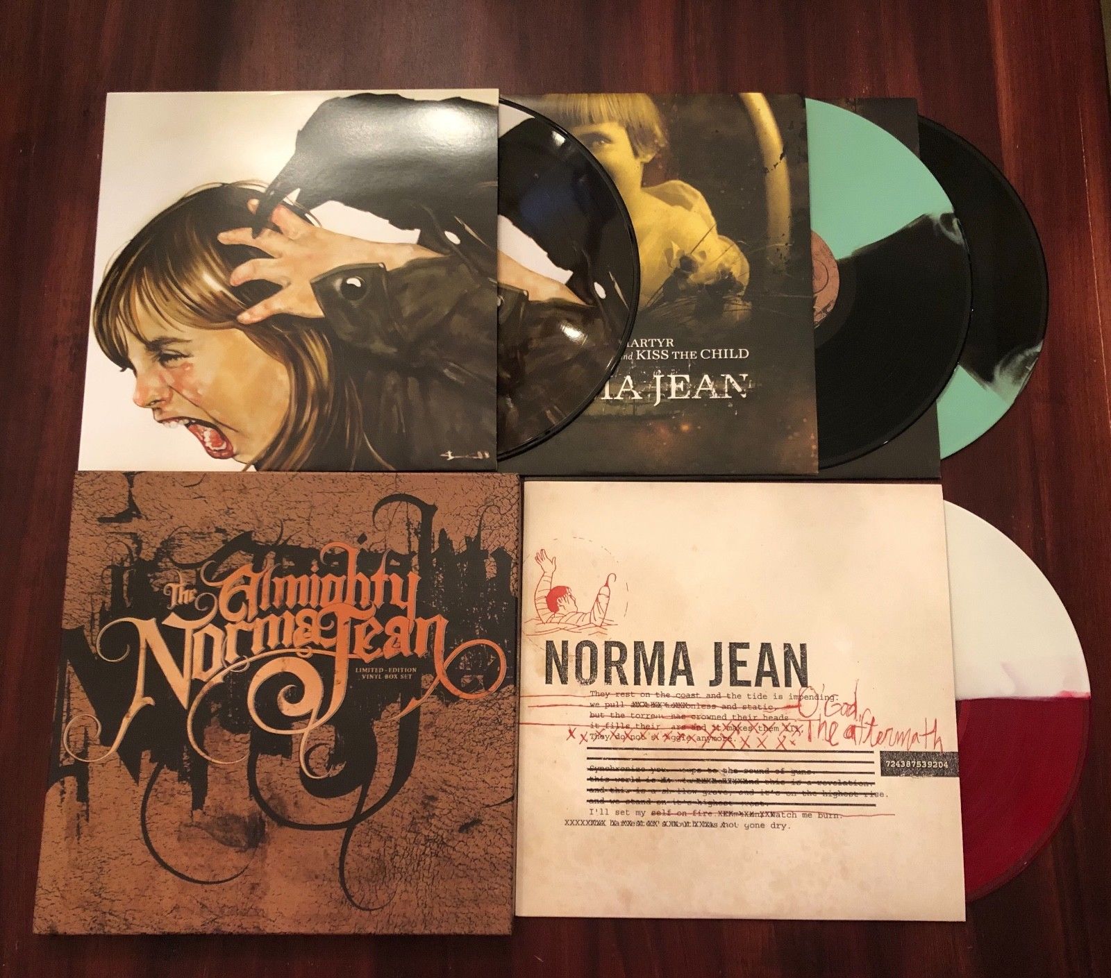 Referencing the almighty norma jean limited edition vinyl boxset 2xlp album re gre lp album re red lp al sh 59 1 lyrics printing mistake on the back of the second bless the martyr and kiss the child lp s sleeve.