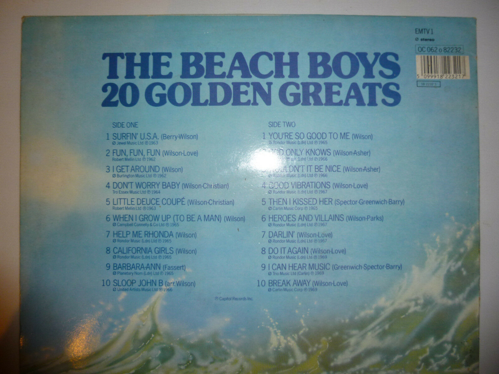 Original pressings 20 golden greats came with white on black boxed capitol and emi logos a thin card inner sleeve advertising other beach boys albums.